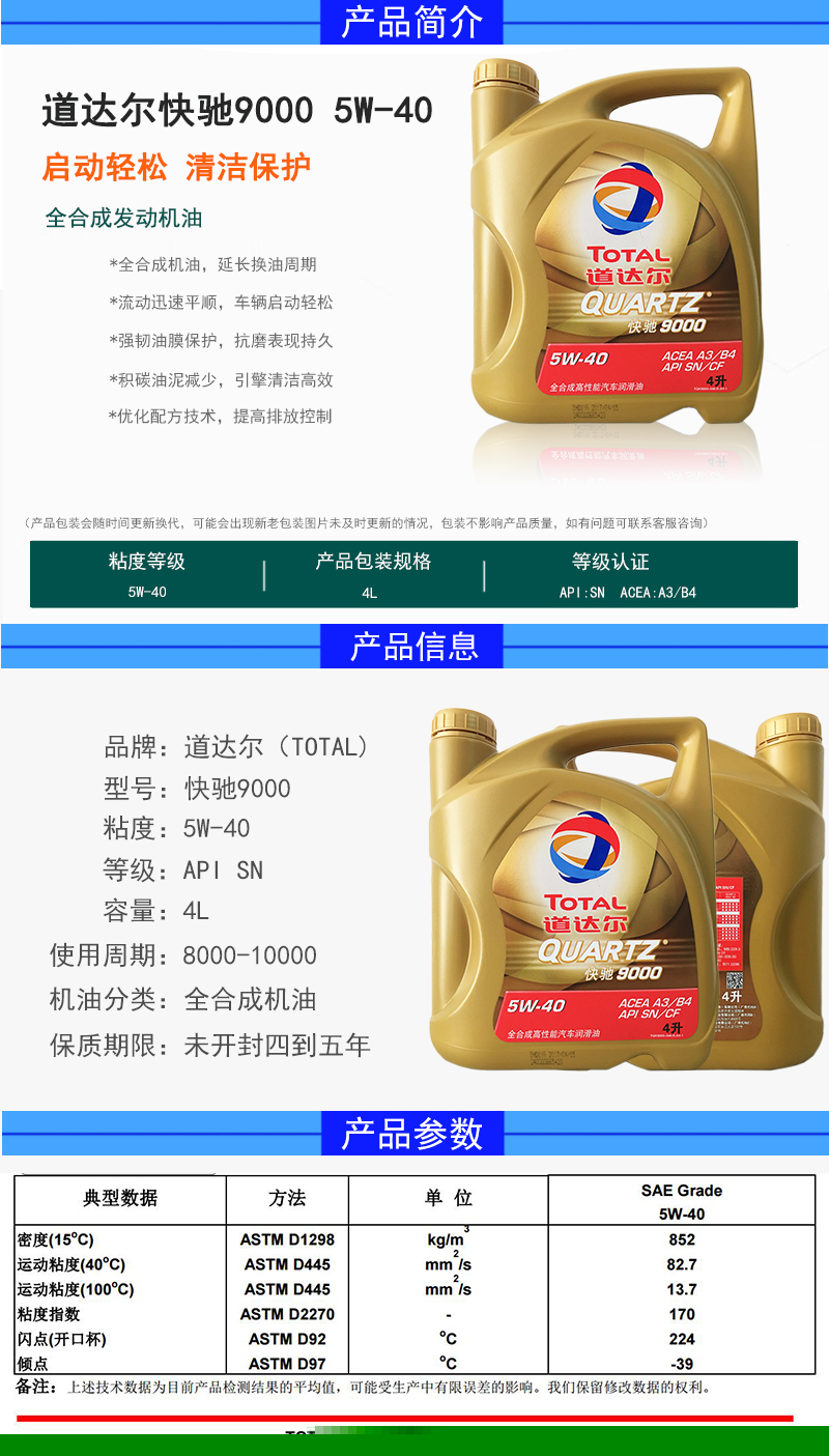 Total(TOTAL)快駆9000合成オリル潤滑油5 W 40 SN級4 L+1 Lセト