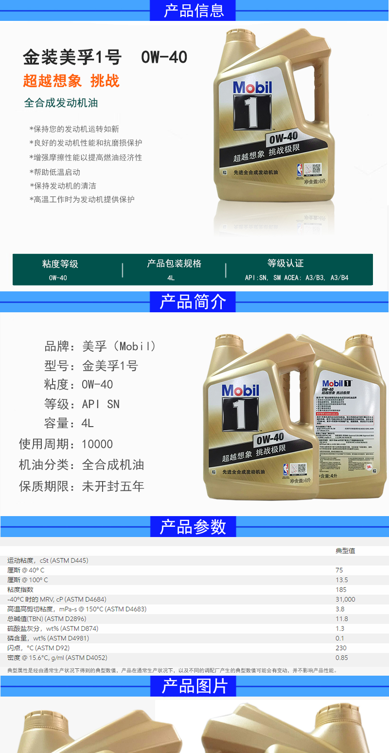Mobil(Mobil)金Mobil 1号0 W-40 Mobil 1号全合成自動車オーラルSN 4 L+1 Lセト